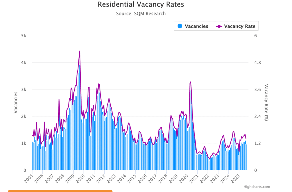 Vacancy rates are at 1.1% (SQM Research) well below the 3% balanced-market level. Drivers of ongoing tightness: