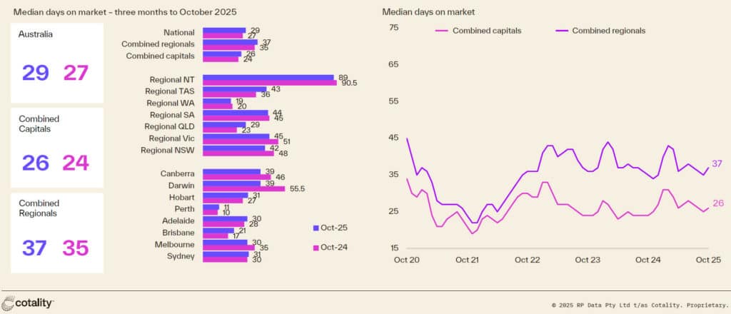 The national median time on market inched higher over the three months to October to 29 days, up from 28 days in Q3. While above the selling times seen this time last year, properties are currently selling around a week faster than the average over the past decade (37 days), with Hobart (31 days) being the only capital to see its median days on market exceed the 10-year benchmark (20 days).