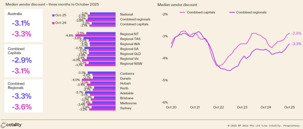 Low stock levels and rising buyer activity have skewed conditions further in favour of sellers, with the national median vendor discount rate reaching its lowest level in more than three and a half years at 3.1%. Vendors in Brisbane (2.6%) and Perth (2.6%) recorded the lowest discounting rates over the three months to October, while sellers in regional Tasmania offered the highest (3.8%). However in Sydney it’s -2.9% versus -3.2%. to the same period last year.